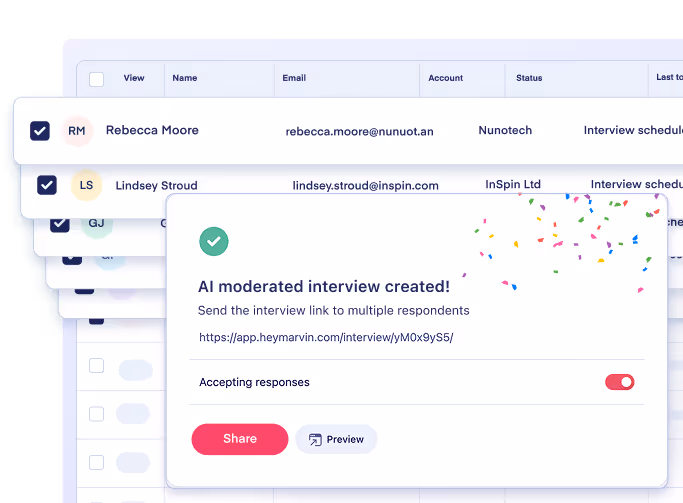Marvin’s AI Moderated Interviewer is built for speed and ease of use. You can get your study up and running much faster than traditional interview setups. Simply upload your discussion guide, define your parameters, and you're almost ready to go. The intuitive interface means less time on setup and more time gathering valuable insights.