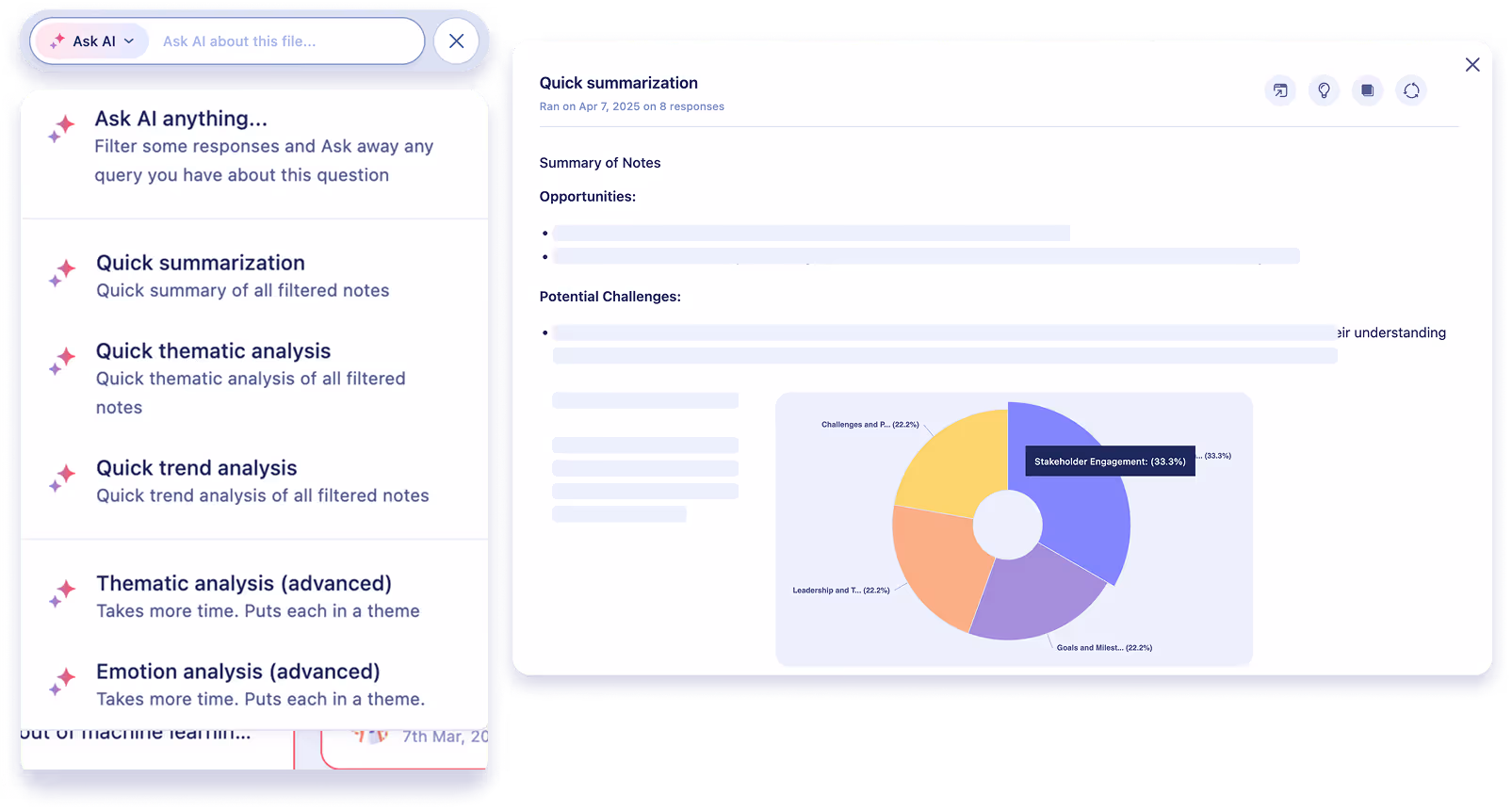 Your shortcut for targeted thematic exploration. Focus your analysis with precision using the pre-built analysis prompts, or ask any research questions based on your chosen data.