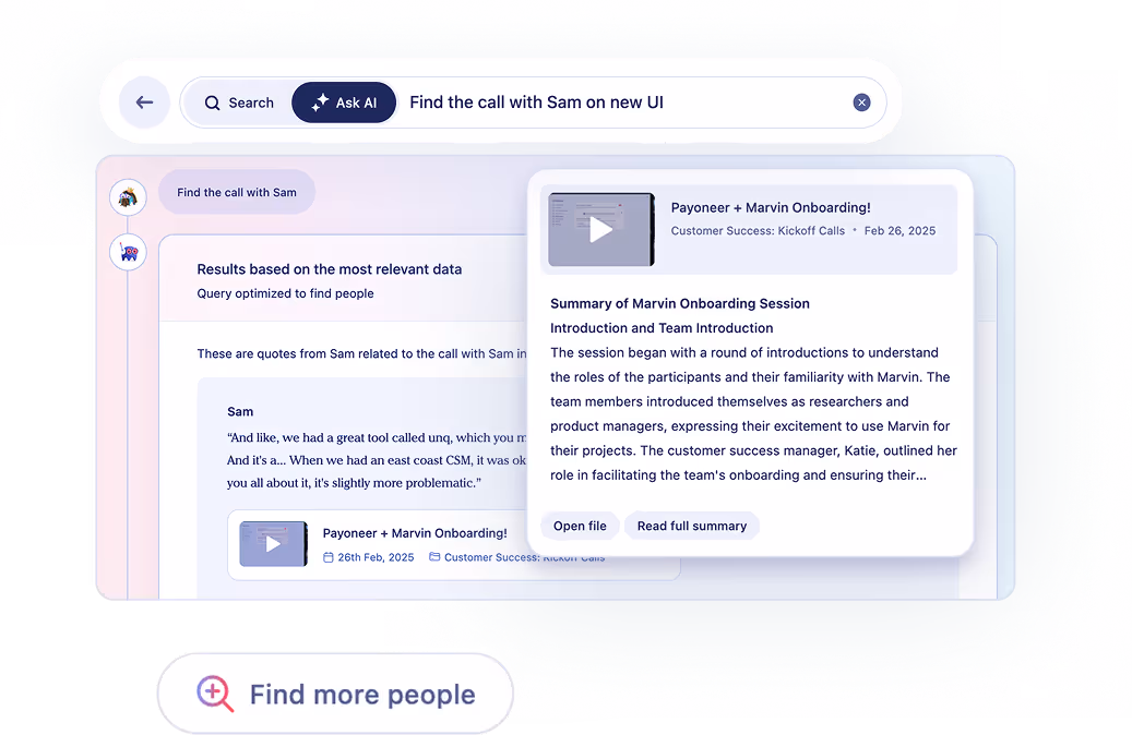 Go beyond keyword-based searching. Ask AI is trained to discover insights you never thought to look for, uncover hidden connections, and locate feedback or conversations of specific participants.