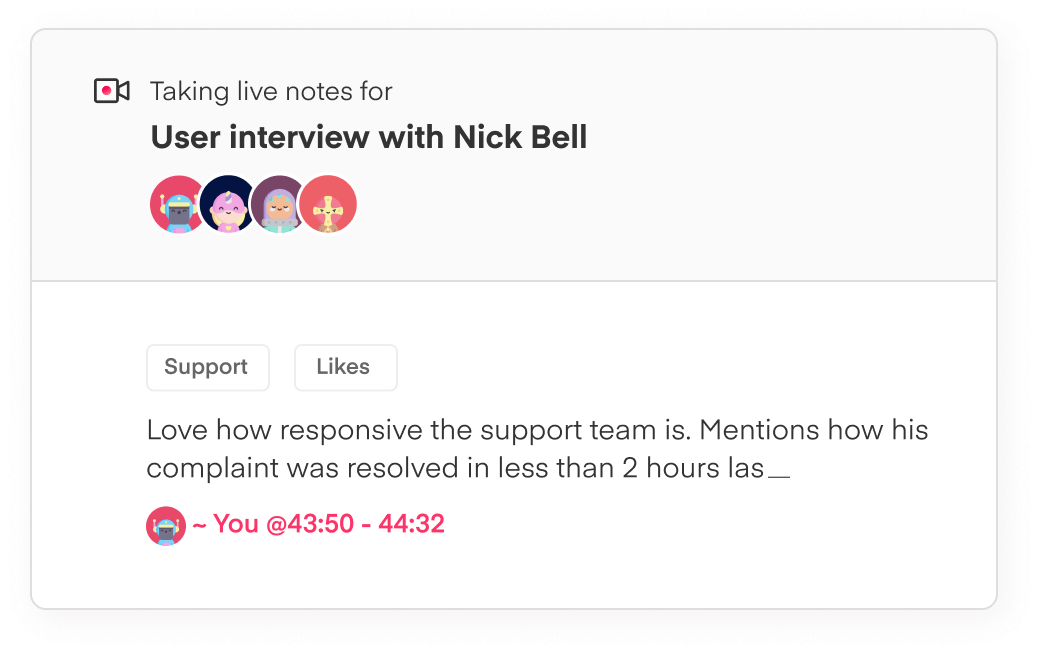 Invite your whole team to watch a virtual interview or focus group even if they aren’t on the meeting invite. They’ll see what you see in real time and can capture their own insights and context using Live Notes.