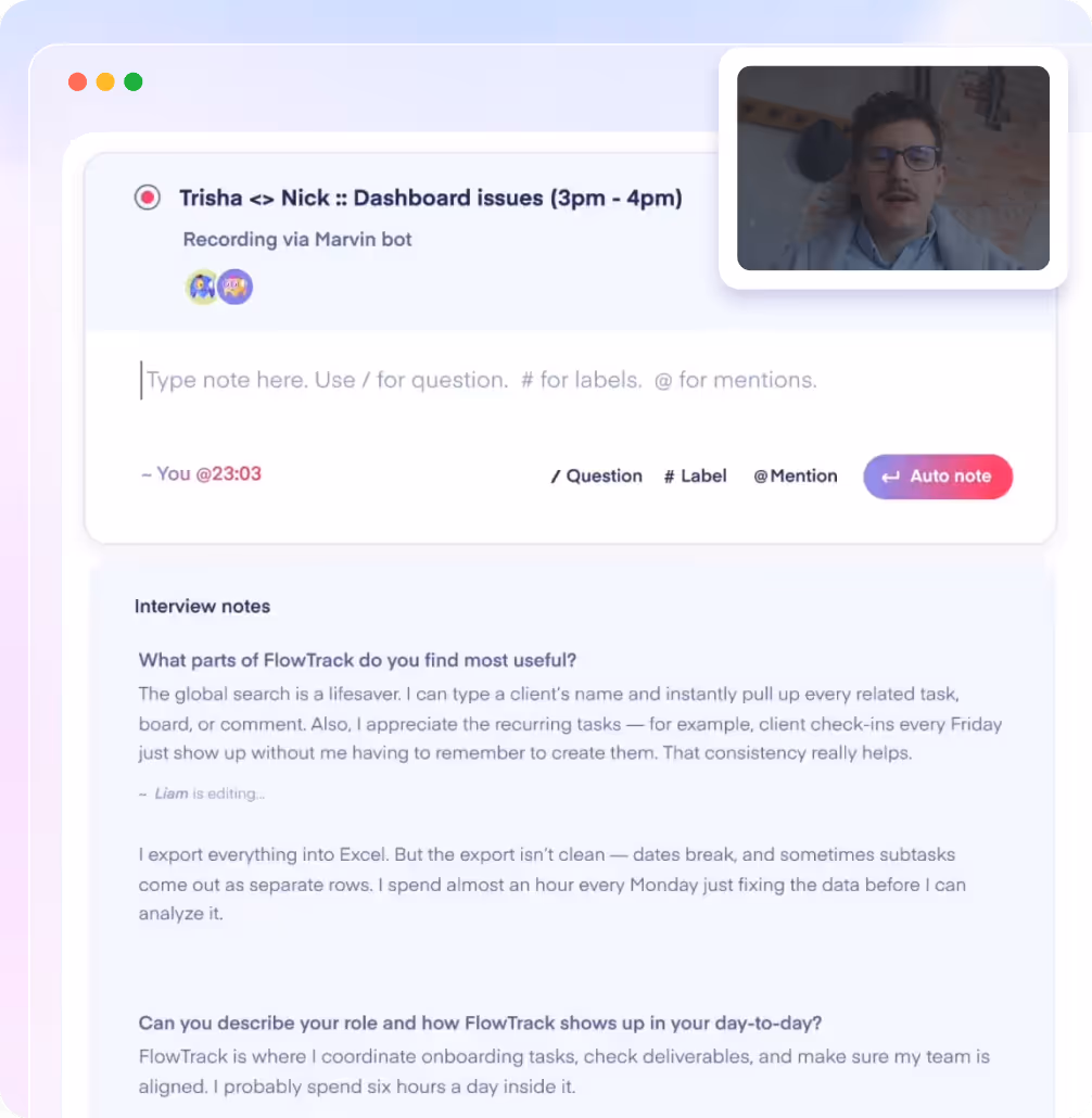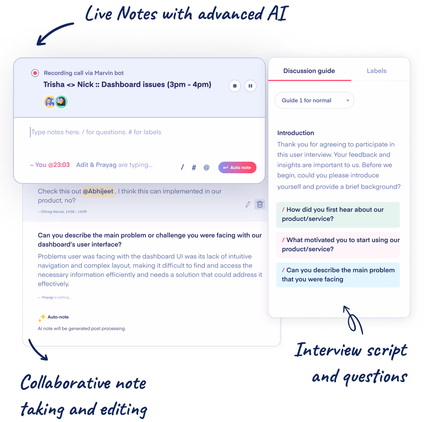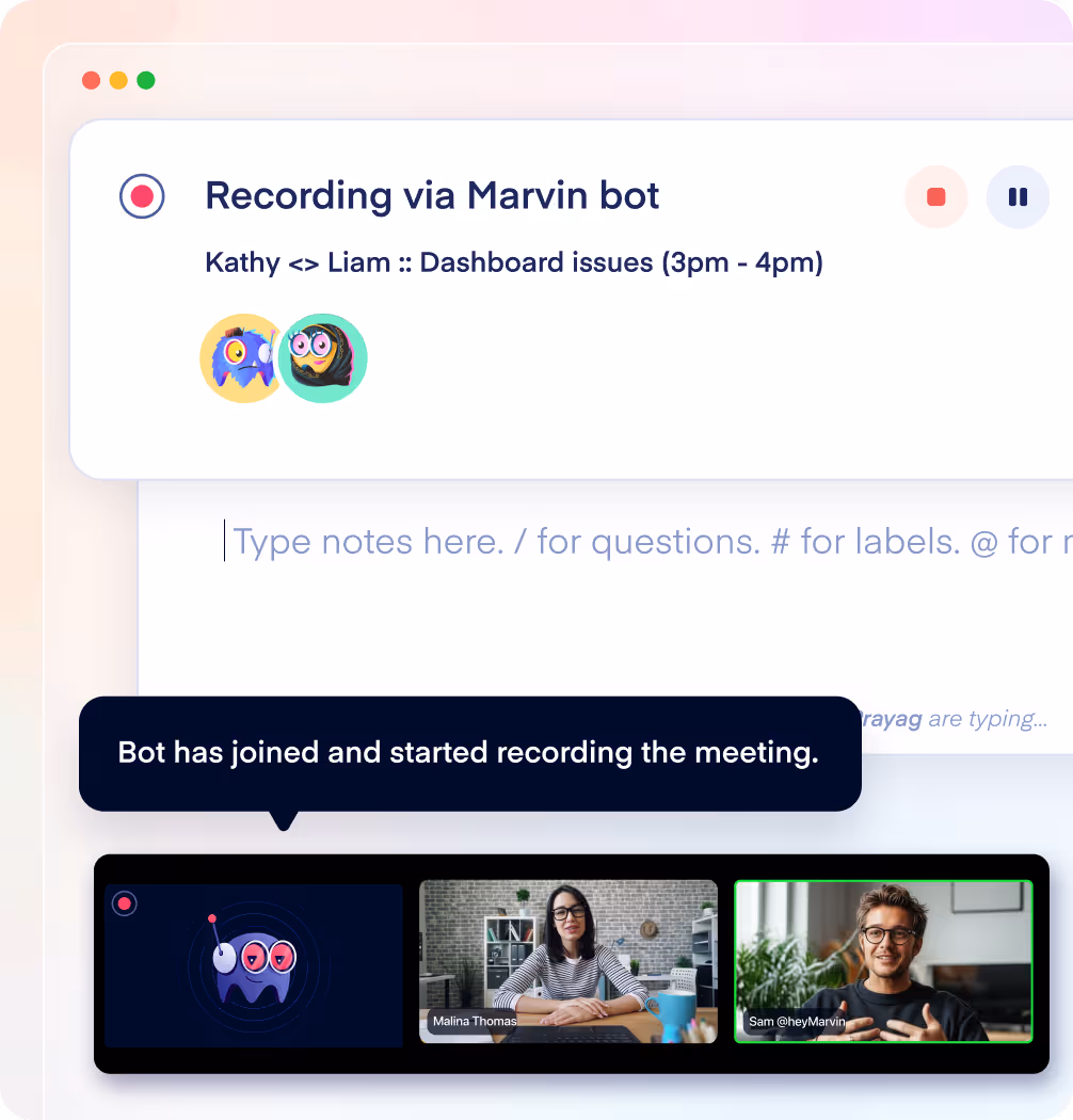 Stop scribbling and start listening. Marvin records, transcribes, and highlights key moments for you.