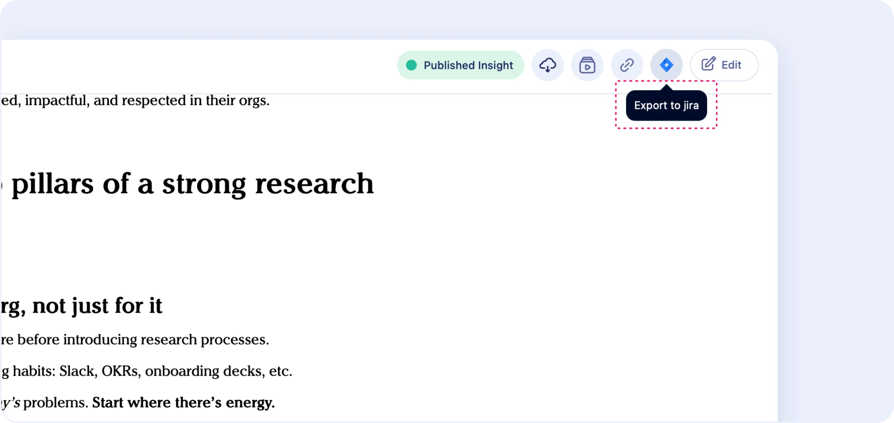 Bridge the gap between research and development. Attach your Marvin Insight reports directly to Jira tickets. This makes insights immediately actionable and provides developers with the "why" behind their work, augmenting their expertise and speeding up the product development cycle.