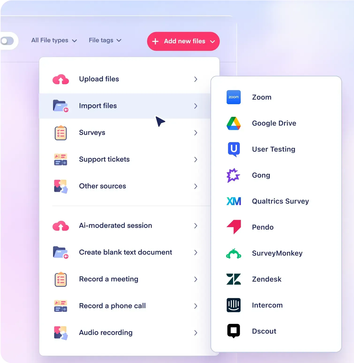 Marvin provides a collaborative workspace where you can share findings, discuss insights, and work together with your team, including PMs, designers, and other stakeholders. Marvin also breaks down data silos by allowing you to integrate with platforms typically used by customer-facing teams. You can connect with tools like Gong for sales call analysis and Zendesk or Intercom for support ticket data. The one-click integrations let you incorporate passive feedback from these tools into your product research. Marvin's AI analyzes and identifies key themes in these customer conversations, providing a more holistic view of the customer experience.